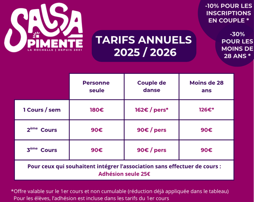 La somme de l'adhésion annuelle et du 1er cours correspond aux 180euros de cotisation annuelle pour 1 cours, auxquels se rajouteront 90€ par cours supplémentaires choisis.